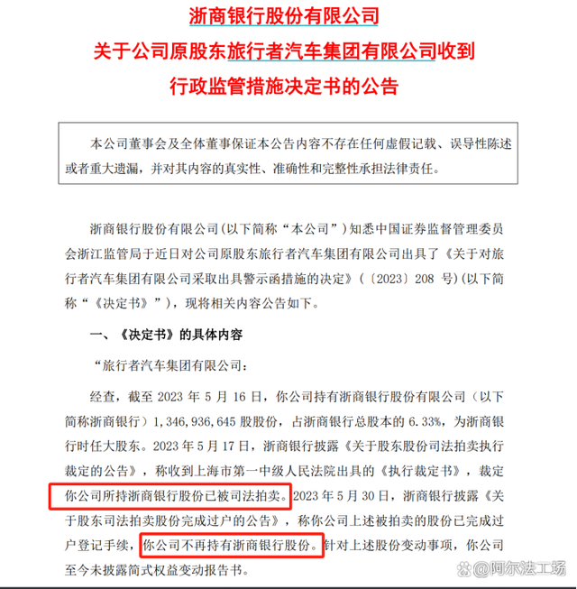 在吴小晖的违法行径被一一揭露后,闻名一时的安邦集团,也被中国保监会实施接管。登记在旅行者汽车名下的浙商银行股份由法院依法拍卖。