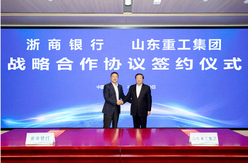 活动现场,山东重工集团副总经理申传东、浙商银行行长助理侯波分别代表双方签署战略合作协议。