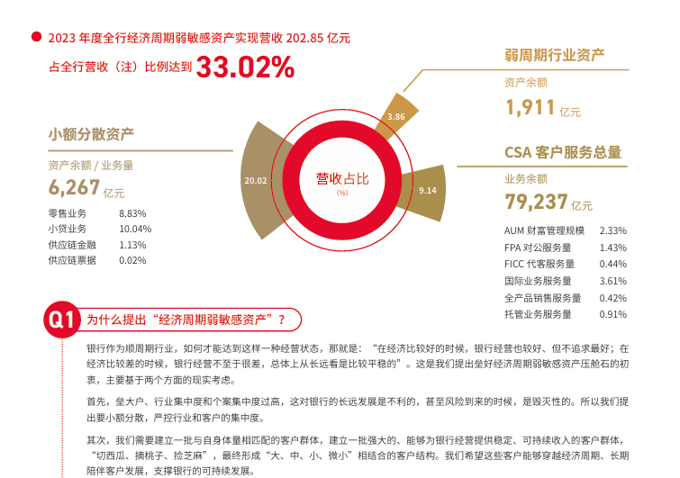 从具体行动来看,主要包括优先投放小额分散资产,新增贷款中的70%要投向小额分散资产;提高弱周期行业资产比重;多赚绿色中收和绿色收入;坚定不移压降存款付息率等举措。