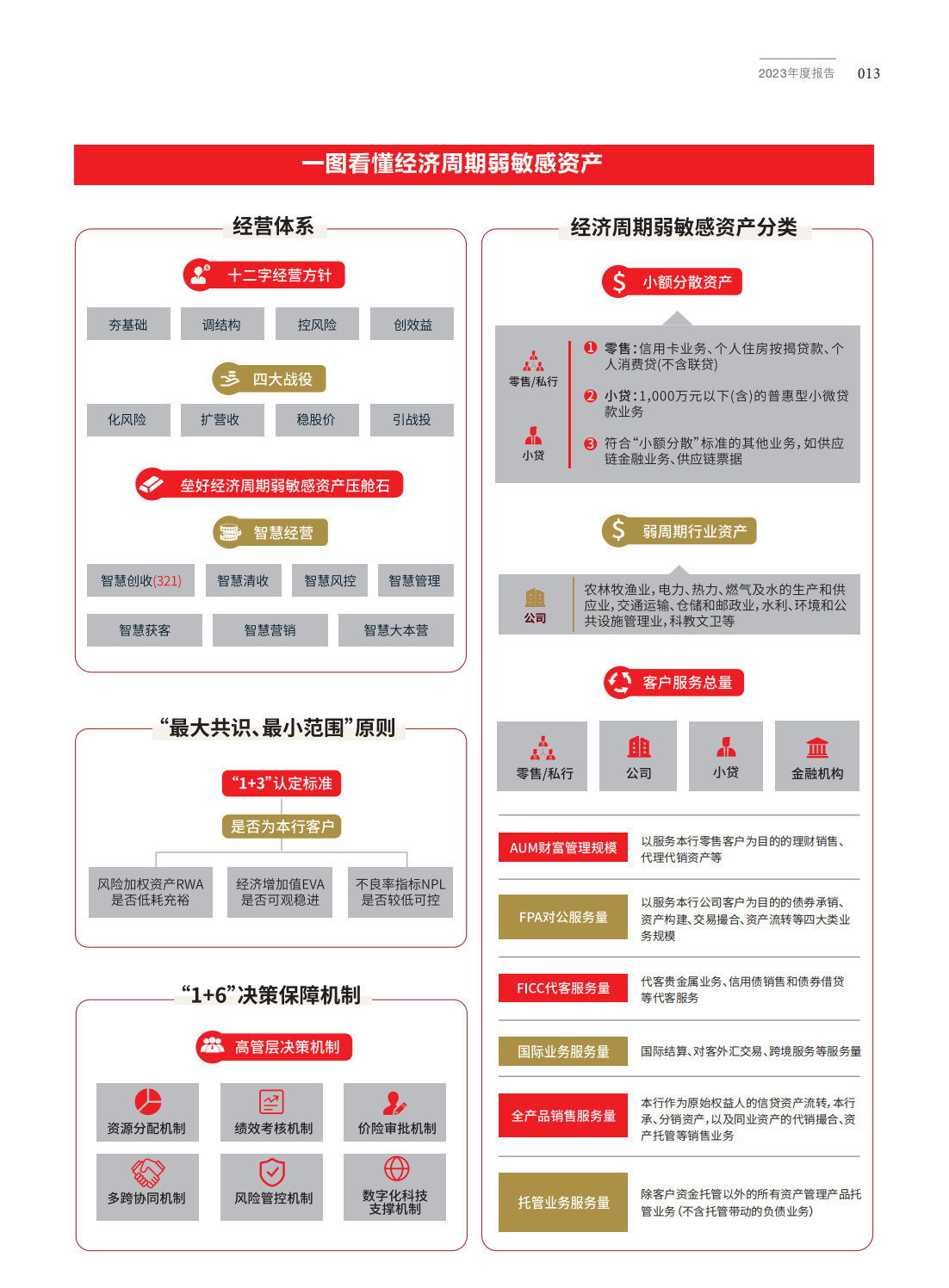 综合来看,经济周期弱敏感资产策略关注的正是国家重点支持的、与经济周期相关性较弱,但又顺应经济社会发展趋势的领域,这与五篇大文章的要求相契合。具体到业务分类上,经济周期弱敏感资产所包含的“小额分散资产、弱周期行业资产和CSA客户服务总量”三大业务,也与五篇大文章的内涵相互映照。