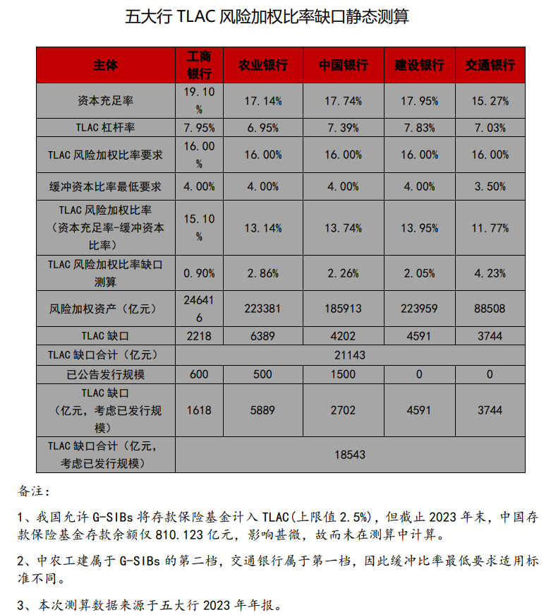 另外从TLAC 风险加权比率和 TLAC 杠杆比率两个指标考虑,目前各家银行均已满足 TLAC 杠杆比率的要求,但是离TLAC 风险加权比率仍然存在一定的差距,补充资本的急迫性其实也各有不同,根据五大行2023年年报数据进行静态测算,不考虑已公告的发行规模,工农中建交的TLAC缺口约为2218亿元、6389亿元、4202亿元、4591亿元、3744亿元,合计约为21143亿元(其中交行2027年初达标即可)。补充资本的急迫性从低到高排序分别为工行、交行、中行、建行、农行,急迫性越高的银行在发行利率上有可能有更多的让步,议价的空间可能相对较大。