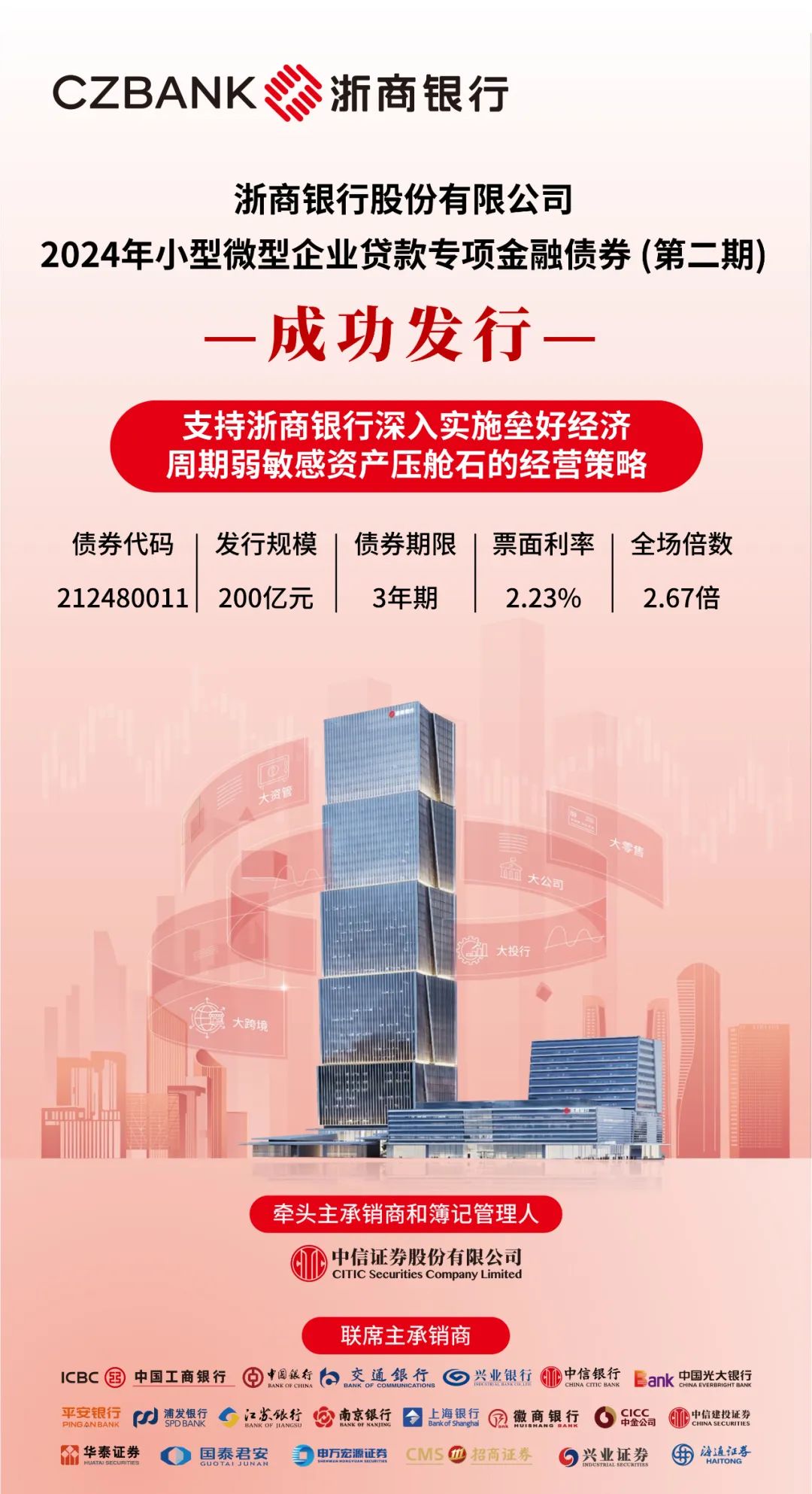 本期债券发行规模200亿元,期限3年,票面利率2.23%,全场倍数2.67倍。本次发行吸引了130余家投资者参与认购,涵盖国有大型银行、股份制银行、城商行、农商行、境外行、理财子、基金、券商、保险等各类投资机构,体现了市场对浙商银行垒好经济周期弱敏感资产压舱石经营策略及小微金融业务高质量发展的充分认可。