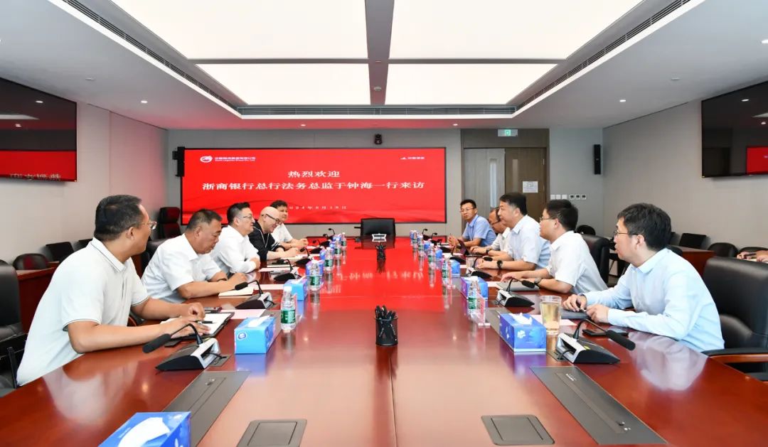 6月18日,浙商银行总行法务总监于钟海一行到访中储,公司党委书记、董事长房永斌与其座谈交流。浙商银行总行顾问傅贤生;公司总会计师武凯、副总经理王勇、总经理助理申崇志参加会谈。