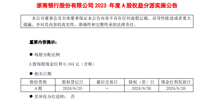 6月19日晚间,浙商银行发布了2023年年度A股权益分派实施公告。根据公告,A股每股现金红利人民币0.164元(含税),现金红利发放日为2024年6月26日。