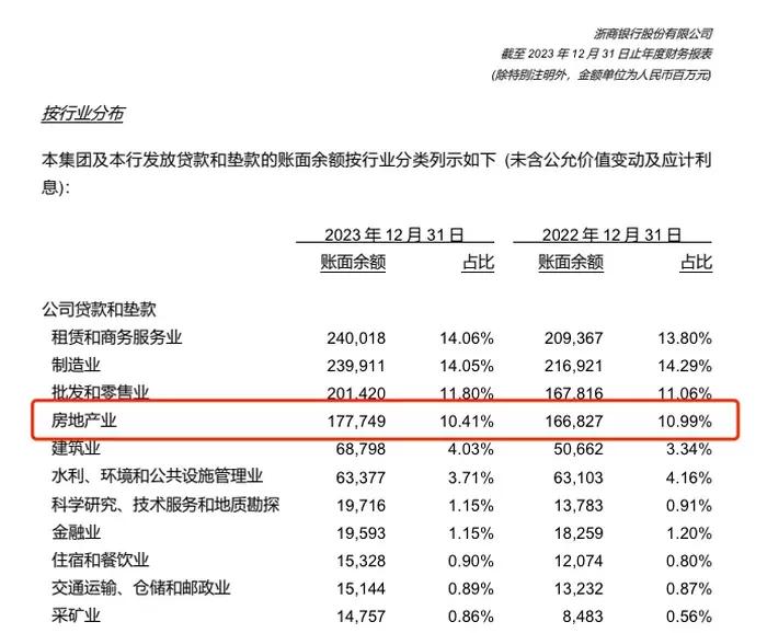 其一,是在各个银行纷纷压降对房地产业的贷款和垫款之际,浙商银行对该行业的信贷投放不降反升,从2022年的1668.27亿元上升到上述1777.49亿元;占比从10.99%微微下降到10.41%。