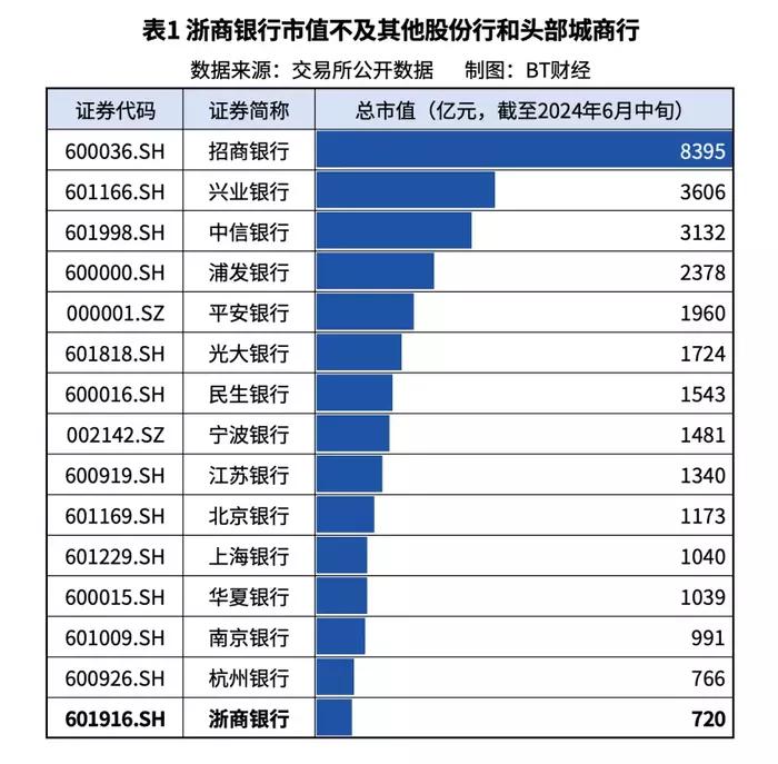 值得注意的是,浙商银行亮眼的增长数据背后,藏着基数较小的问题。目前浙商银行的市值是9家A股上市股份制银行里最小的一家,也不及宁波银行( 002142.SZ )、北京银行( 601169.SH )等头部城商行。