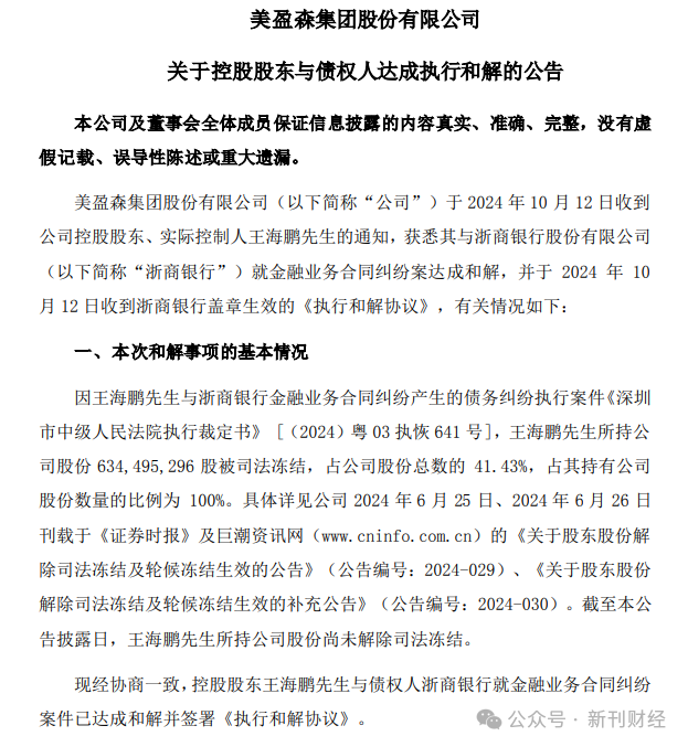 根据此份和解协议,王海鹏以7.35亿元作为其欠款本金,按照约定向银行还款。本金清偿后浙商银行同意部分解除王海鹏已查封的美盈森股票的冻结。