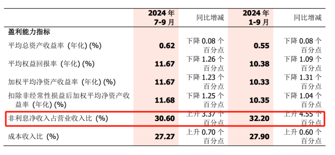 非利息净收入169.04亿元,同比增加31.63亿元,增长23.02%。非利息净收入占营业收入比32.20%,同比上升4.55个百分点。