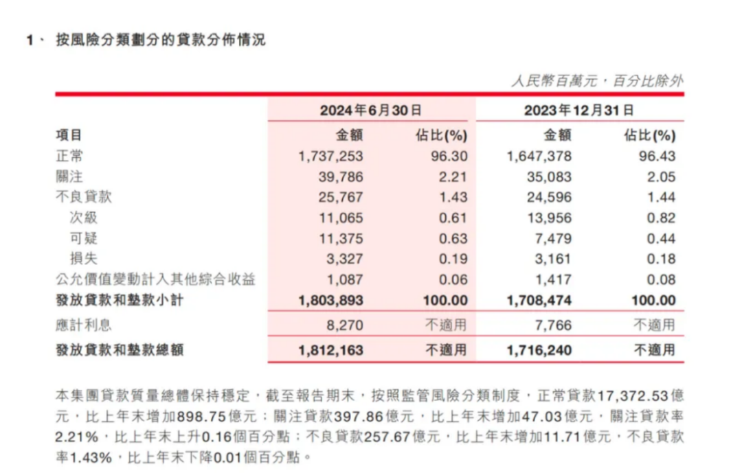 资产质量方面,截至报告期末,浙商银行不良贷款余额259.63亿元,比上年末增加13.67亿元;不良贷款率1.43%,比上年末下降0.01个百分点;