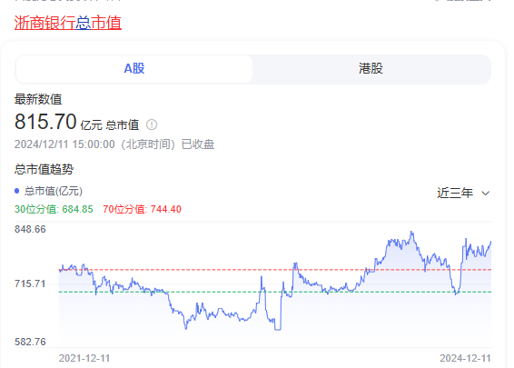 2024年前三季度,浙商银行营收规模是杭州银行的184%,是宁波银行的103%,但在市值上,浙商银行(A股市值为815.70)仅为杭州银行(市值为853.08亿)的95%,宁波银行(市值为1636.37)的49%。