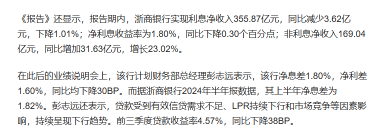 而据财报显示:2024年前三季度,浙商银行利息净收入355.87亿元,同比减少3.62亿元,下降1.01%;净利息收益率为1.80%,同比下降0.30个百分点。