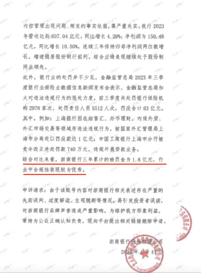 在此前,财银社曾刊文质疑浙商银行内控失衡造成连年罚款居高不下,而浙商银行方面在某平台的盖章投诉函中这样写到: