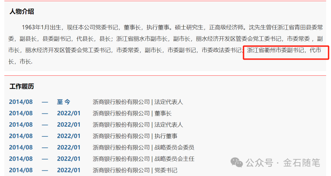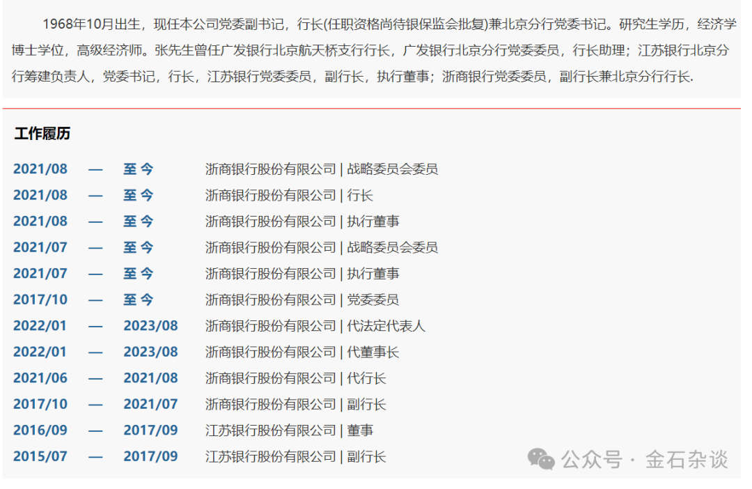 金石杂谈查询发现,浙商银行行长为张荣森,现年56岁,现任浙商银行行长、执行董事、党委副书记,同时兼任北京分行党委书记。此前他任职广发银行,并在广发北分担任要职,随后进入江苏北分,最高做到分行行长,2017年加入浙商,目前接近7年。