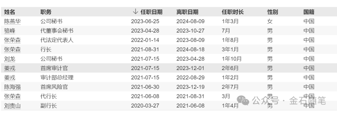 3)2021年至今,浙商银行上演高层大动荡。2021年6月,浙商银行行长徐仁艳、副行长徐蔓萱和副行长、首席风险官刘贵山都提出了辞呈;9月,监事王峰辞职;2022年,副行长吴建伟辞职;2023年4月,刘龙辞去副行长、董事会秘书、公司秘书;12月,姜戎辞去首席审计官职务、解聘陈海强先生兼任的首席风险官职务、郑建明辞去该行副监事长、职工监事职务。