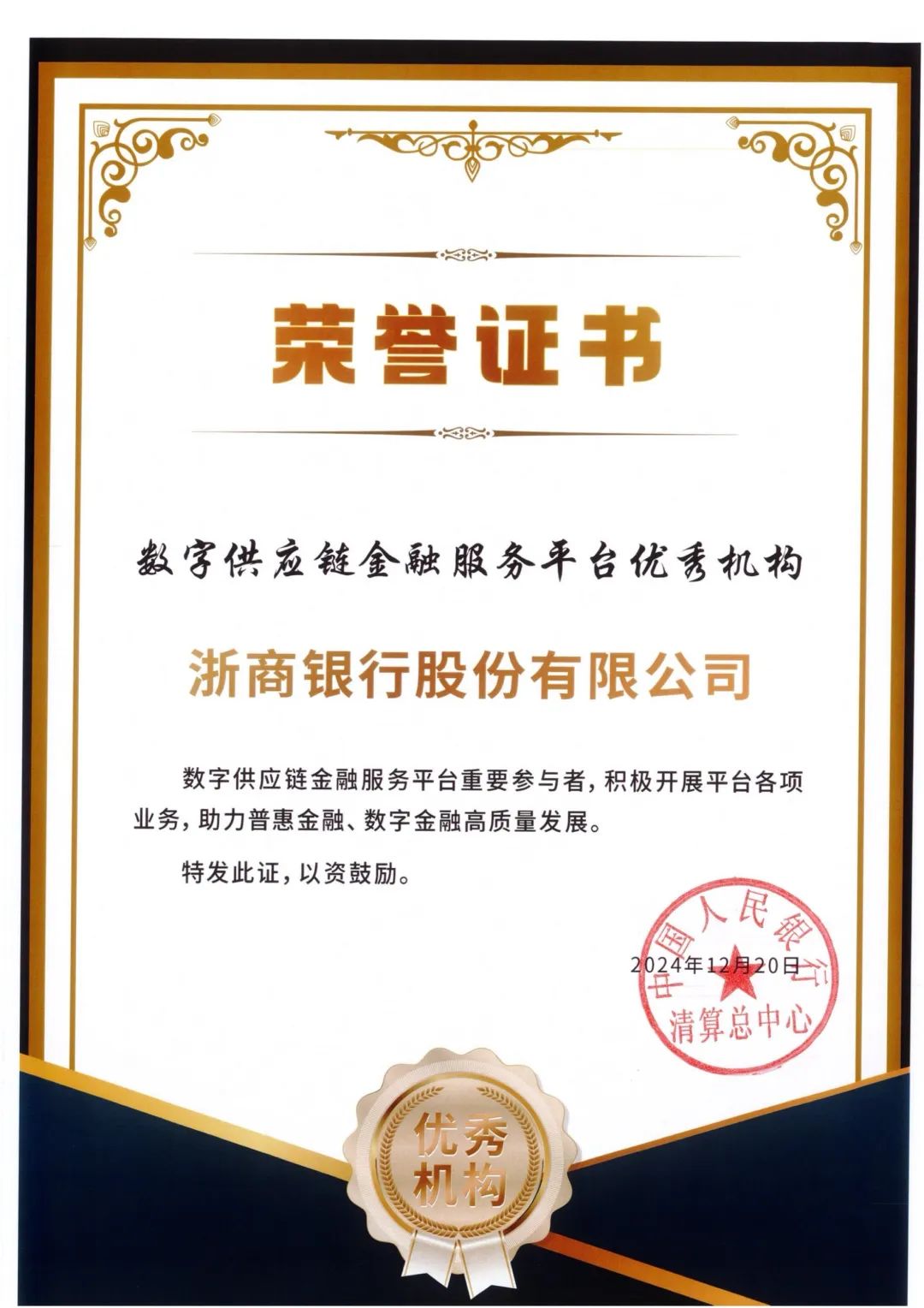 2024年12月20日,中国人民银行清算总中心召开“数字供应链金融服务平台2024年度运行会议”,并对优秀参与金融机构予以表彰。浙商银行凭借在数字供应链金融应用与实践中的突出表现,被评为2024年数字供应链金融服务平台优秀参与机构,是继2021年和2023年获评后,第三次荣获中国人民银行清算总中心表彰。