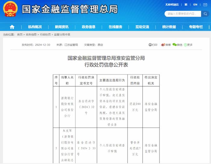 12月30日,国家金融监管总局官网披露的公开处罚信息显示,浙商银行(601916.SH)淮安分行因个人贷款贷前调查不审慎、向无真实资本金的项目发放贷款、虚增存贷款规模、办理无真实贸易背景的贸易融资等违规行为,被淮安金融监管分局处罚200万元。而涉及上述违规的四名相关责任人分别被处5万~7万不等的罚款。
