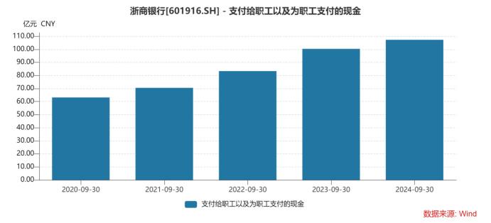 现金流量表显示,2024年前三季度,浙商银行支付给职工以及为职工支付的现金为107亿元,较上一年同期的100亿元,净增加7亿元,同比增长7%。