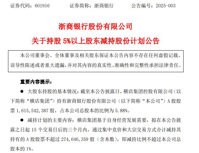 1月21日,浙商银行(601916)公告称,横店集团基于自身经营发展需要,拟在公告披露之日起15个交易日后的三个月内,通过集中竞价和大宗交易方式合计减持其持有的A股股票不超过约2.746亿股(含本数),即减持比例不超过浙商银行总股本的1%。