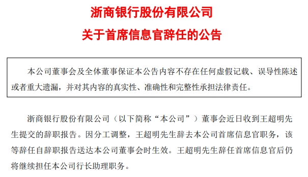 3月12日,浙商银行发布公告称,因分工调整,王超明辞去首席信息官职务。辞任首席信息官后,王超明仍将继续担任行长助理职务。