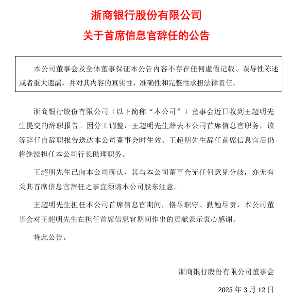 浙商银行行长助理王超明不再兼任首席信息官。