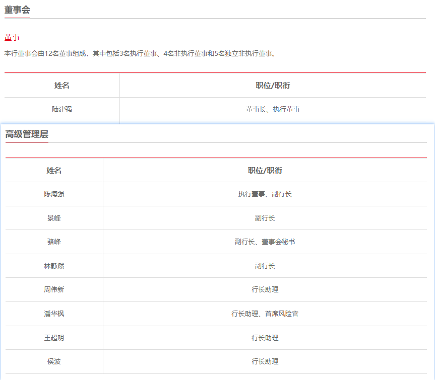 该行现有四名副行长、四名行长助理,其中副行长景峰、骆峰均为准“80后”,行助侯波是“80后”,副行长陈海强和林静然是“准75后”。具体来看:董事长陆建强(1965.4),副行长陈海强(1974.10),副行长景峰(1979.12),副行长、董事会秘书骆峰(1979.9),副行长林静然(1974.6),行长助理周伟新(1971.6),行长助理、首席风险官潘华枫(1972.1),行长助理王超明(1970.10),行长助理侯波(1980.2)。