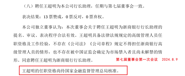 2023年12月19日,浙商银行第六届董事会第十一次会议聘任王超明为行长助理、首席信息官;2024年8月9日,浙商银行第七届董事会第一次会议续聘王超明为行长助理、首席信息官。值得一提的是,两次对外公告文件中,王超明对应两职务任职资格均处于尚待国家金融监督管理总局(简称:金监总局)核准状态,这意味着自加入浙商银行起王超明两职务任职资格至少有8月时间未得获批。