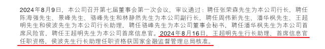 值得一提的是,王超明于2024年8月16日刚刚通过金监总局核准出任行长助理、首席信息官,迄今正式履职未满7月……