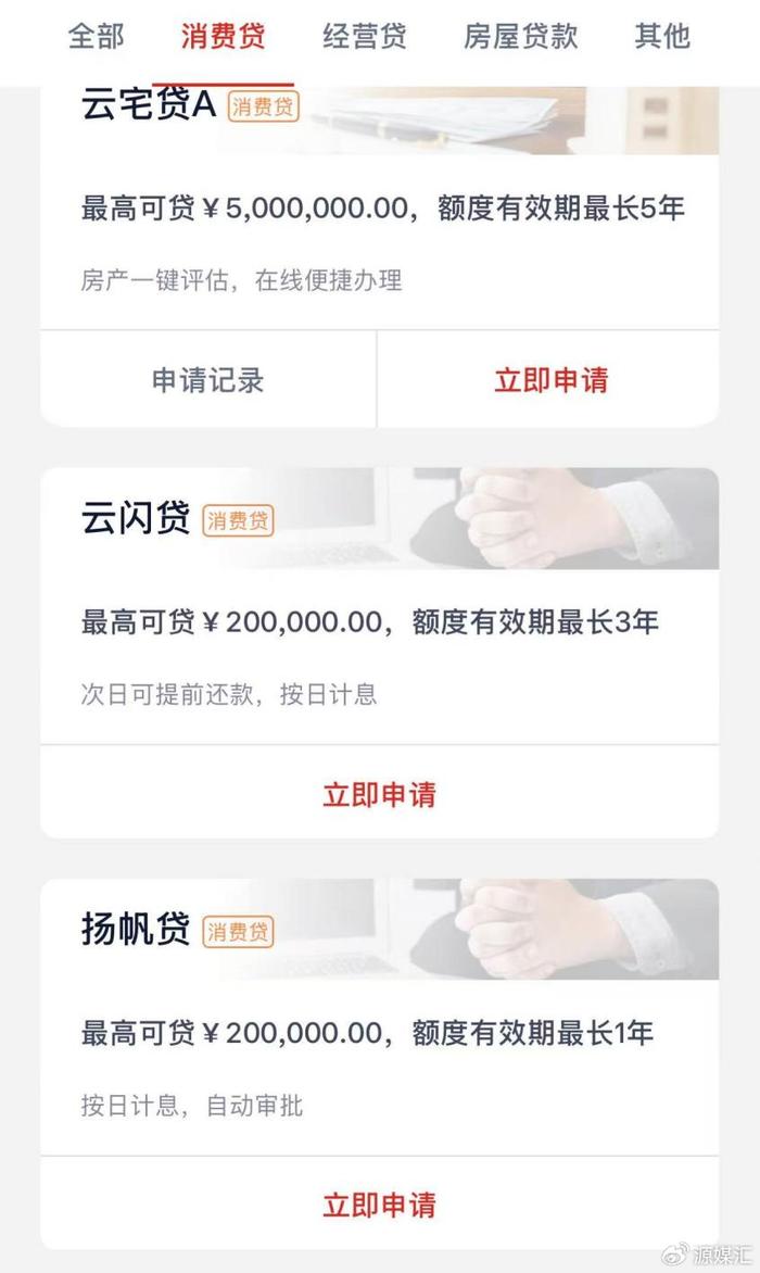 其中,云宅贷A的最高额度可贷500万元,有效期最长达5年,不过需要房产评估;云闪贷最高可贷20万元,额度有效期最长3年;扬帆贷最高也可贷20万元,但是额度最长仅有1年;云信贷的最高额度也可达500万元,额度最长可达5年,而且是纯信用贷。