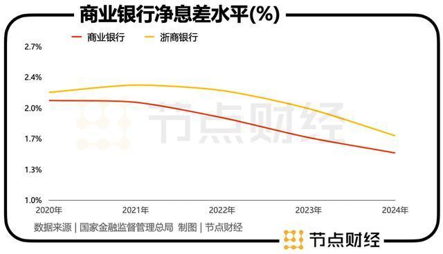 2021年—2023年,浙商银行的净息差分别为2.27%、2.21%、2.01%,2024年为1.71%,跌幅逐年扩大。