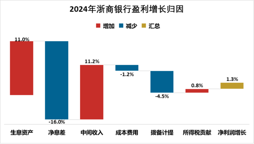 进一步拆解浙商银行的盈利增长驱动因素,风云君发现,正向贡献项主要是生息资产扩张、中间收入增长,拖累项主要是净息差下降及拨备计提增加。