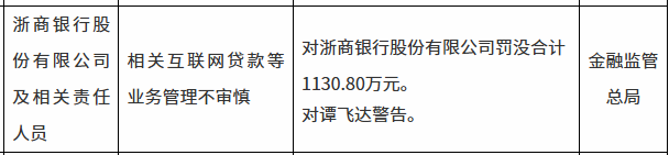 国家金融监督管理总局9月5日,公布行政处罚信息,浙商银行因“相关互联网贷款等业务管理不审慎”被罚没合计1130.80万元。