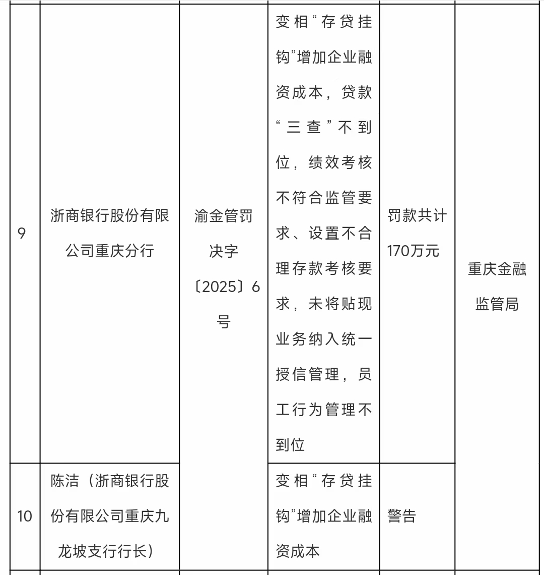 2025年1月27日,浙商银行重庆分行被重庆金融监管局罚款170万元(1位负责人被处罚),违法事实:变相“存贷挂钩”增加企业融资成本,贷款“三查”不到位,绩效考核不符合监管要求、设置不合理存款考核要求,未将贴现业务纳入统一授信管理,员工行为管理不到位。