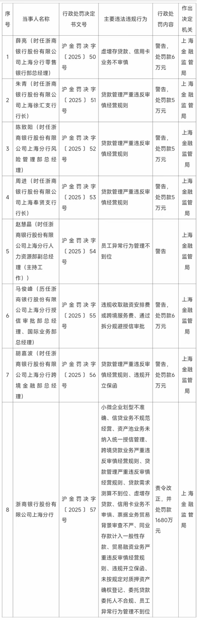 同日,浙商银行上海分行被上海金融监管局1680万元(7位负责人被处罚),违法事实:小微企业划型不准确、信贷业务不规范经营、资产池业务未纳入统一授信管理、跨境贷款业务严重违反审慎经营规则、贷款管理严重违反审慎经营规则、贷款需求测算不到位、虚增存贷款、信用卡业务不审慎、票据业务贸易背景审查不严、同业存款计入一般性存款、贸易融资业务严重违反审慎经营规则、违规开立保函、未按规定对质押资产确权登记、委托贷款委托人不合规、员工异常行为管理不到位。