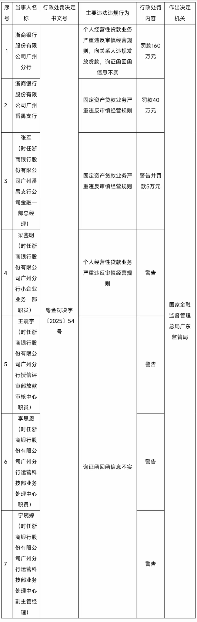 2025年7月9日,浙商银行广州分行被广东金融监管局罚款160万元(5位负责人被处罚),违法事实:个人经营性贷款业务严重违反审慎经营规则,向关系人违规发放贷款,询证函回函信息不实。