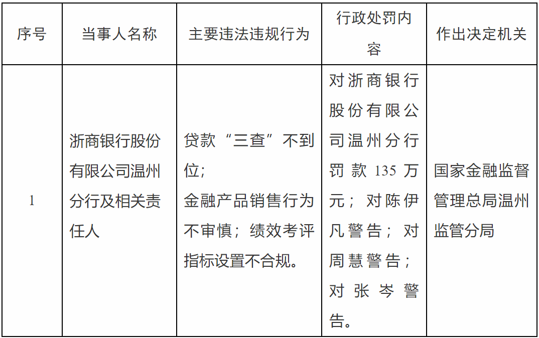 2025年8月4日,浙商银行温州分行被国家金融监督管理总局温州监管分局罚款135万元,违法事实:贷款“三查”不到位;金融产品销售行为不审慎;绩效考评指标设置不合规。