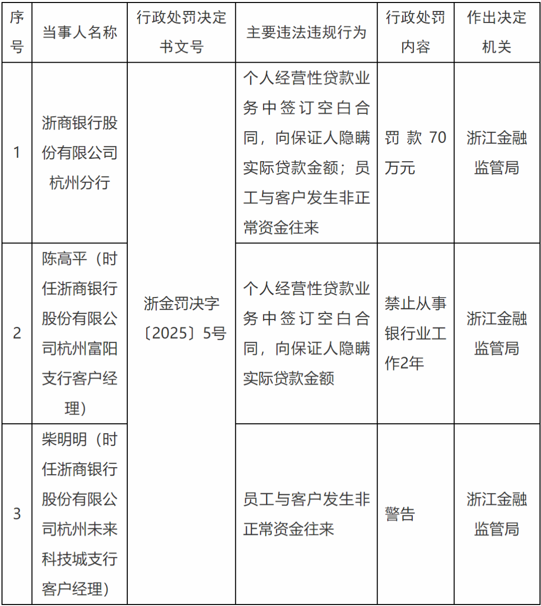 2025年4月1日,浙商银行杭州分行被浙江金融监管局70万元(2位负责人被处罚),违法事实:个人经营性贷款业务中签订空白合同,向保证人隐瞒实际贷款金额;员工与客户发生非正常资金往来。