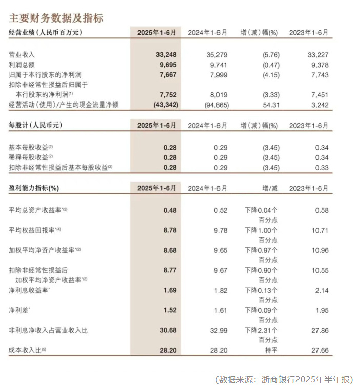 2025年上半年,浙商银行迎来2019年A股上市后首次中报营收净利双降,营收同比降5.76%,归母净利润同比降4.15%。管理层提及“主动调低经营目标”与“行业净息差下行”的影响,但核心原因是收入结构双重压力。