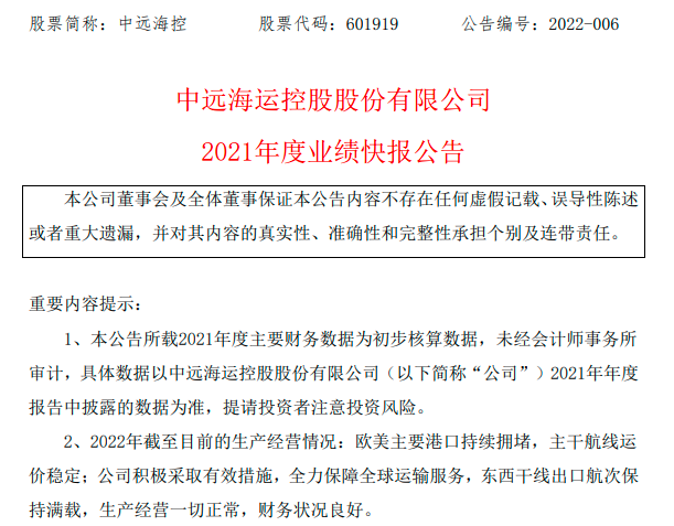 中远海控也表示,2022年以来,欧美主要港口持续拥堵,主干航线运价稳定。公司东西干线出口航次保持满载,生产经营一切正常,财务状况良好。