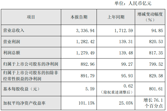 预计公司实现归属于上市公司股东的净利润约人民币892.96亿元,与上年同期相比增加约人民币793.69亿元,增长约799.52%。