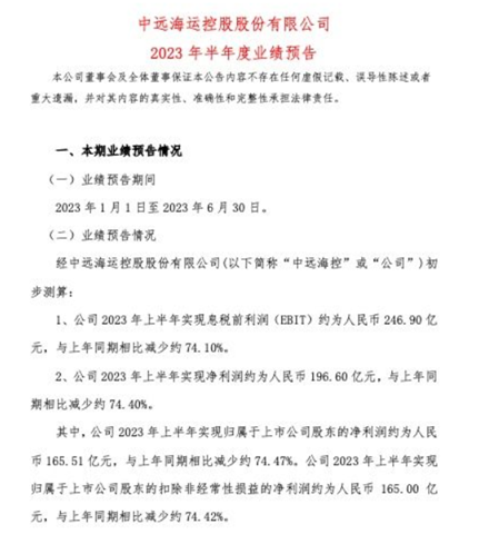 7月3日晚间,中远海运控股股份有限公司(中远海控;601919.SH)发布2023年半年度业绩预告。公告称,公司2023年上半年实现归属于上市公司股东的净利润约为人民币165.51亿元,与上年同期相比减少约74.47%。公司2023年上半年实现归属于上市公司股东的扣除非经常性损益的净利润约为人民币165.00亿元,与上年同期相比减少约74.42%。