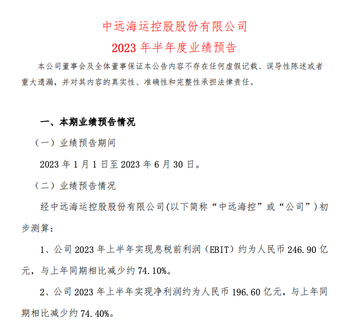 中远海控在业绩预告中透露,公司初步测算:公司2023年上半年实现息税前利润(EBIT)约为人民币246.90亿元,与上年同期相比减少约74.10%。净利润约为人民币196.60亿元,与上年同期相比减少约74.40%。
