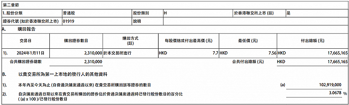 中远海控1月11日在港交所公告,今日斥资约1766.52万港元回购231万股公司股份,回购价格为每股7.56港元-7.70港元。