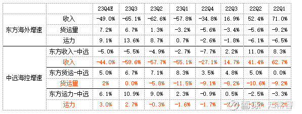 Q4季度东方海外货运量同比+7.2%,两者货运量变动差值要更窄,最大差值为23Q1季度8.3%,最小为22Q1季度0%。从海外下半年数据来看,货运量运载情况已经出现恢复,增速小幅度出现提升,以差值逐步缩窄的线性测算。当设定至为5%时,中远Q4货运量增速为+2%,对应运输约599万标准箱。