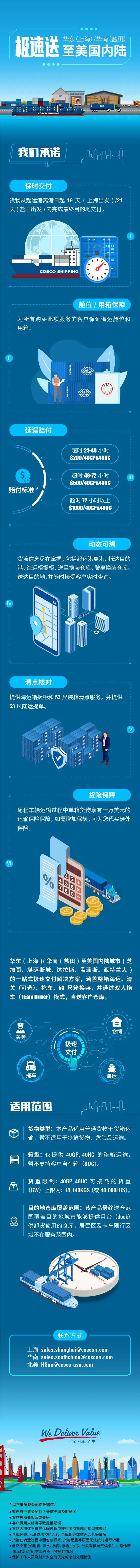 中远海控旗下中远海运集运提供覆盖华南(上海)/华南(盐田)至美国多个主要内陆城市的综合性一站式极速交付服务,旨在为客户提供高效、稳定、可靠的物流解决方案,实现全程货物动态可追溯,按时交付有保障。