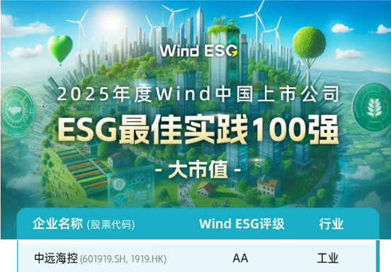 近日,为彰显ESG领域的优异实践者、推动ESG理念深化落地,Wind基于全部A股及港股最新Wind ESG评级,甄选出各行业ESG表现佼佼者。中远海控(601919.SH,1919.HK)在可持续发展领域再获佳绩,成功入选“2025年度Wind中国上市公司ESG最佳实践100强(大市值)”;公司Wind ESG评级达到AA级。