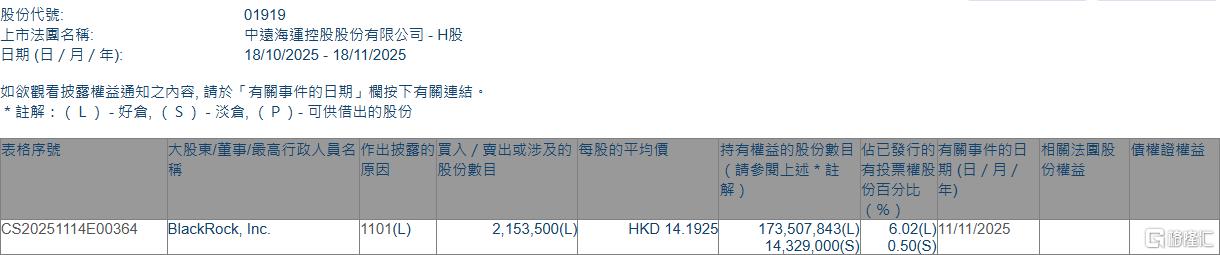 格隆汇11月18日丨根据联交所最新权益披露资料显示,2025年11月11日,中远海控(01919.HK)获BlackRock, Inc.在场内以每股均价14.1925港元增持好仓215.35万股,涉资约3056.35万港元。