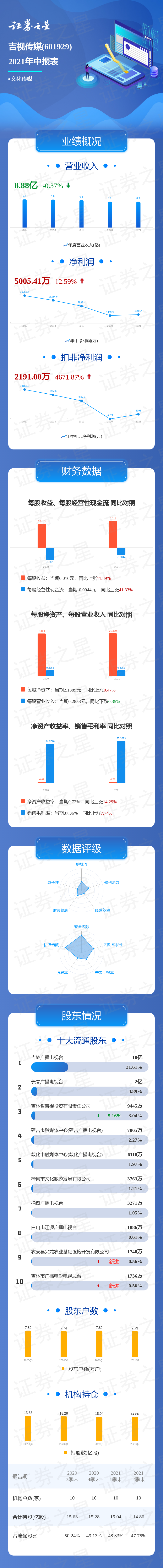 吉视传媒2021中报显示,公司主营收入8.88亿元,同比下降0.37%;归母净利润5005.41万元,同比上升12.59%;扣非净利润2191.0万元,同比上升4671.87%;负债率51.28%,投资收益3414.09万元,财务费用2673.7万元,毛利率37.36%。
