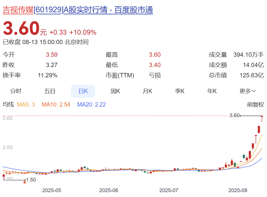 截至8月13日收盘,吉视传媒股价报3.60元,较8月7日收盘价2.23元累计上涨61.43%,引发市场广泛关注。