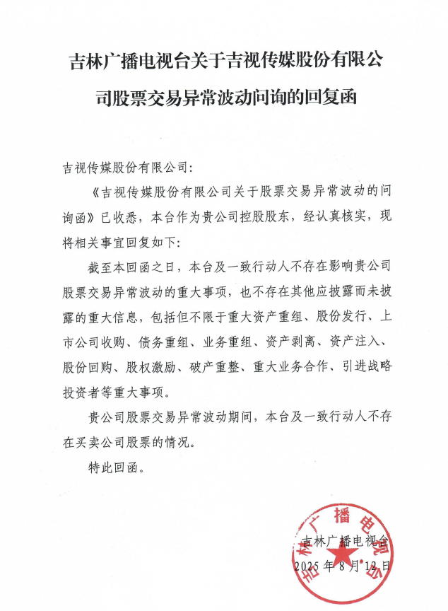 此外,公司还连续2次自查并问询控股股东吉林广播电视台,双方均确认不存在应披露而未披露的重大事项,包括重大资产重组、股份发行、上市公司收购、资产注入、股权激励等。控股股东及其一致行动人在股价异常波动期间亦未买卖公司股票。