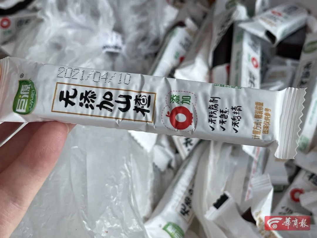 7月16日上午,在西咸新区沣东新城吾悦广场,华商报记者见到了刘先生买的发霉山楂条。刘先生说,他就是在该吾悦广场负一层的永辉超市买的。记者注意到,购物袋里有多个都是被剥开外包装的,有部分长了毛。再看生产日期,有2020年底生产的、也有2021年生产的,保质期为12个月,的确都在保质期内。这款名叫巨源牌的山楂条外包装打着“无添加山楂、无防腐剂、无色素、无香精”等字样。现场华商报记者要求刘先生再剥几个试试,发现有一个山楂条在外包装完好的情况下,剥开后的山楂条有发绿发黑的情况,该山楂条的生产日期为2020年12月15日,也是在保质期内的。